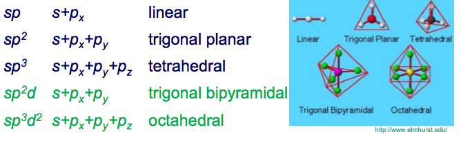 Five hybridizaion schemes exist: sp, sp2, sp3, sp3d and sp3d2.