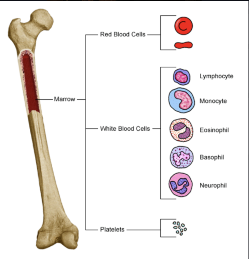blood cell formation; process begins in red bone marrow with a pluripotent stem cell