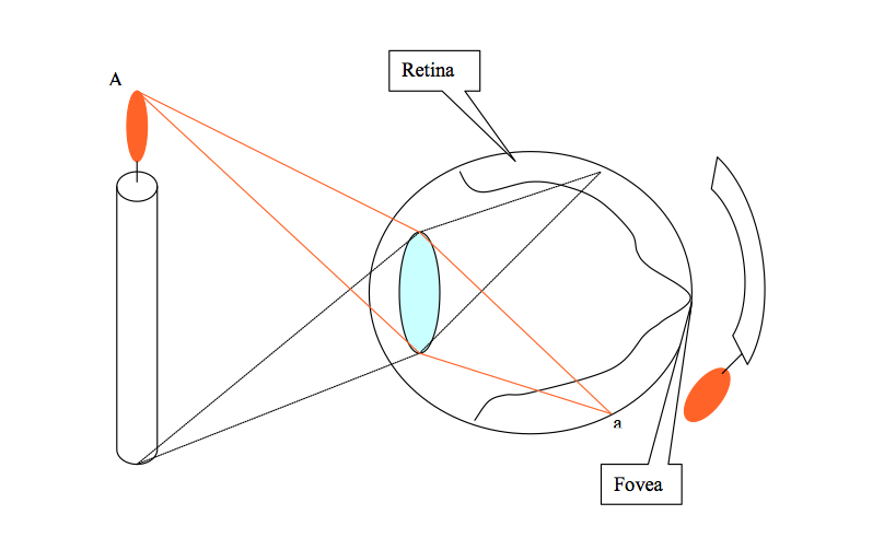A neuron’s receptive field is the location in the environment (or the surface of the body) from which an appropriate stimulus will change that cell’s activity. For example light at ‘A’ (the tip of the flame in the diagram above) will affect the activity of retinal cell in location ‘a’ in the retina. Cells in different locations in the retina have receptive fields in different locations in the visual field.
