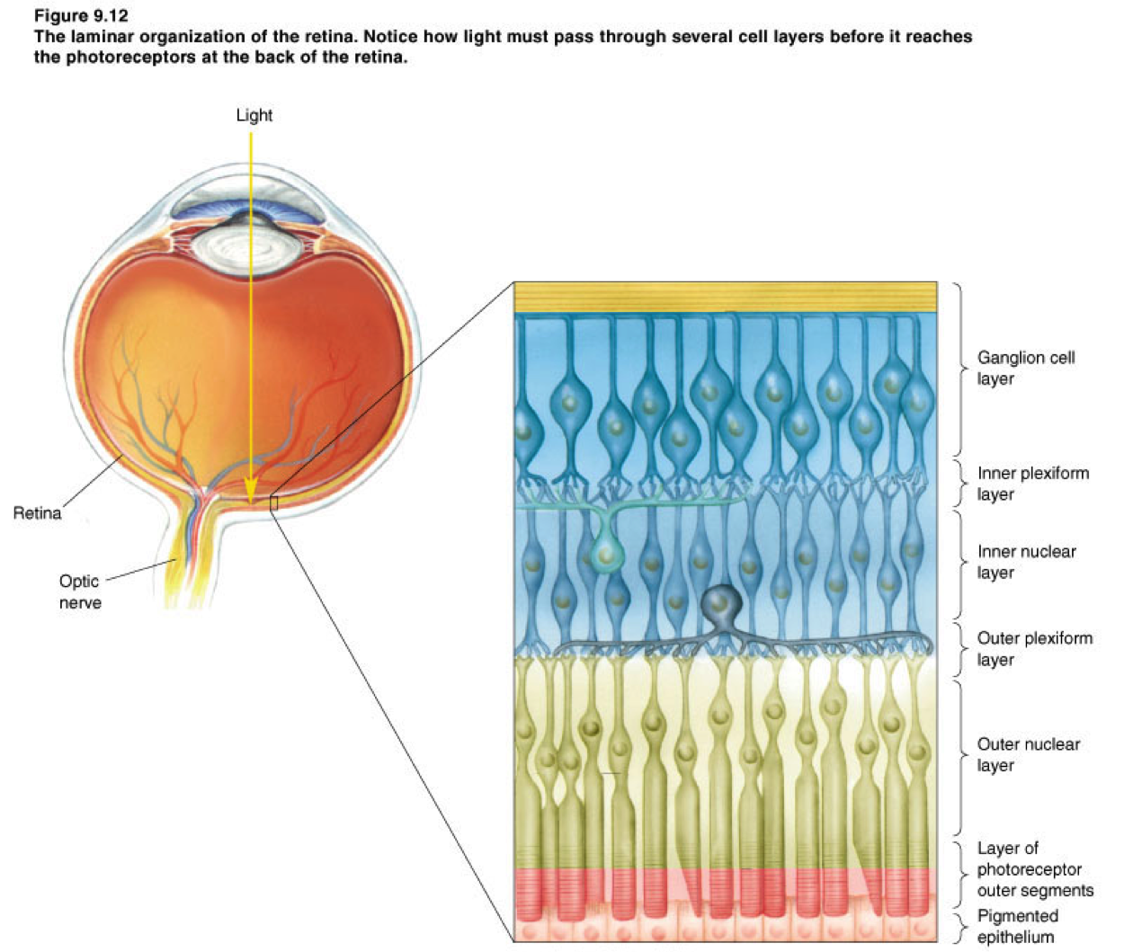 A. The retina consists of several thin layers of cells distributed across the inside of the eye.