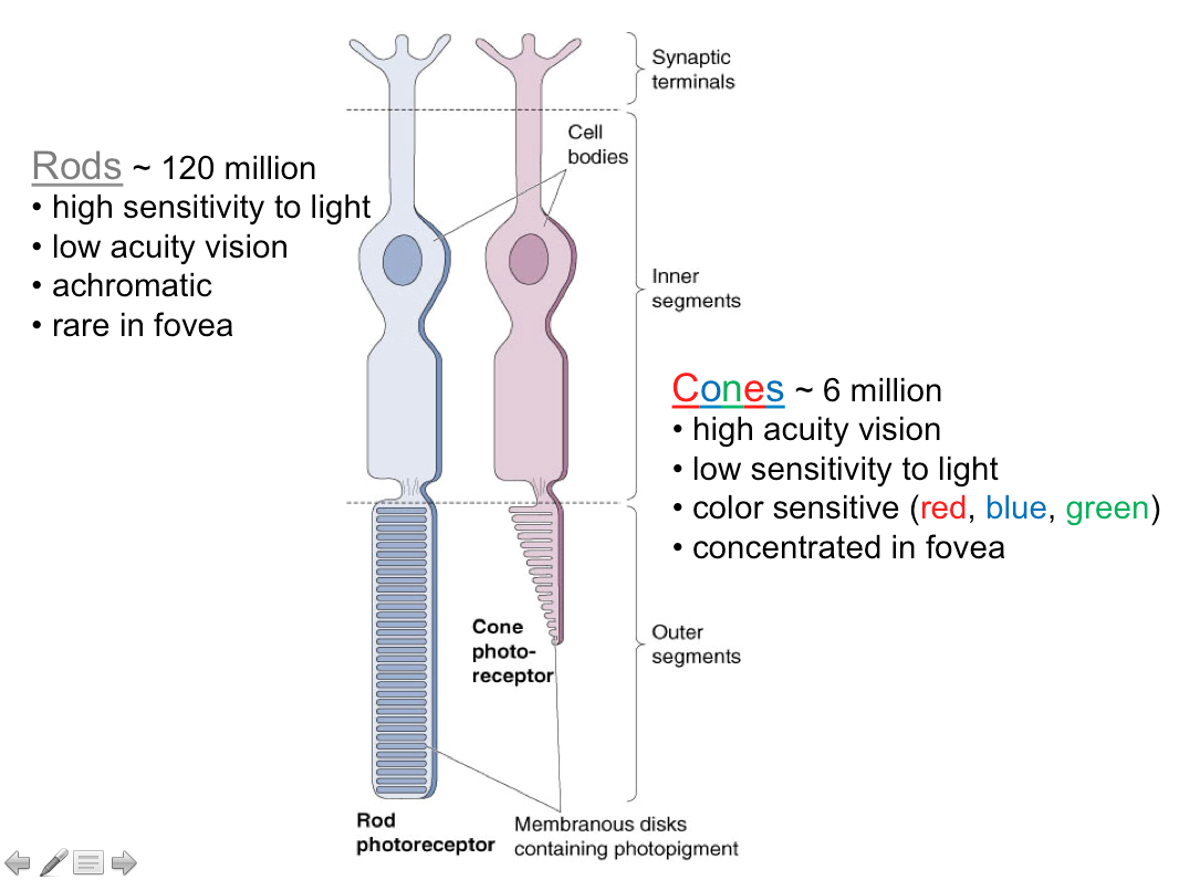 4. Rods also have more photopigment densely packed into the membrane of the optic disks, so they absorb more light.