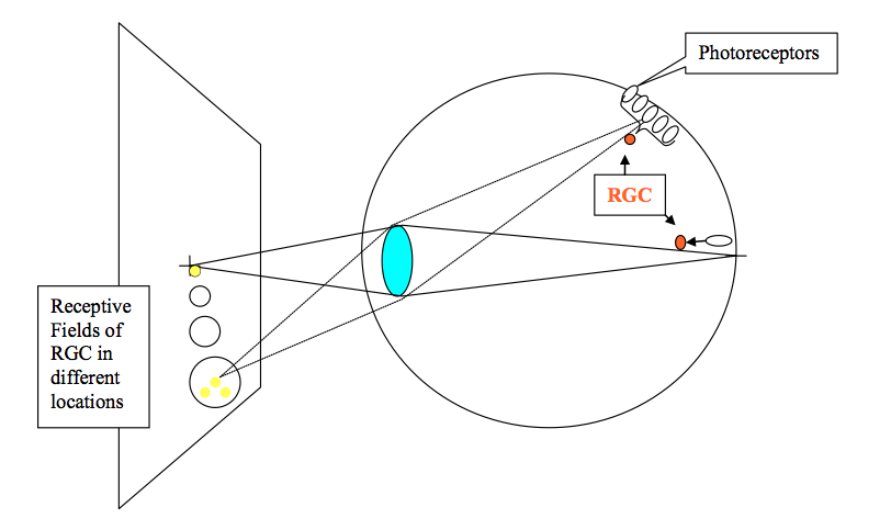 A neuron’s receptive field is the location in the environment (or the surface of the body) from which an appropriate stimulus will change that cell’s activity. The term Receptive Field applies to cells in the visual system other that RGCs and also applies to neurons in other sensory modalities (e.g., touch, auditory).