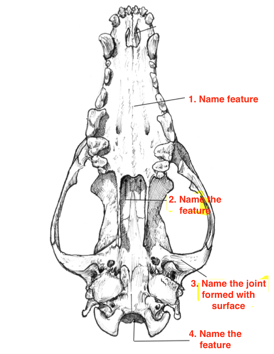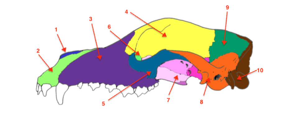 a jigsaw of individual bones that unite at sutures (approx. 33 of them) to form important structures including but not limited to braincase (or cranium), sockets (orbit), twin nasal cavities and the upper jaw, articular processes, bony ear cavities