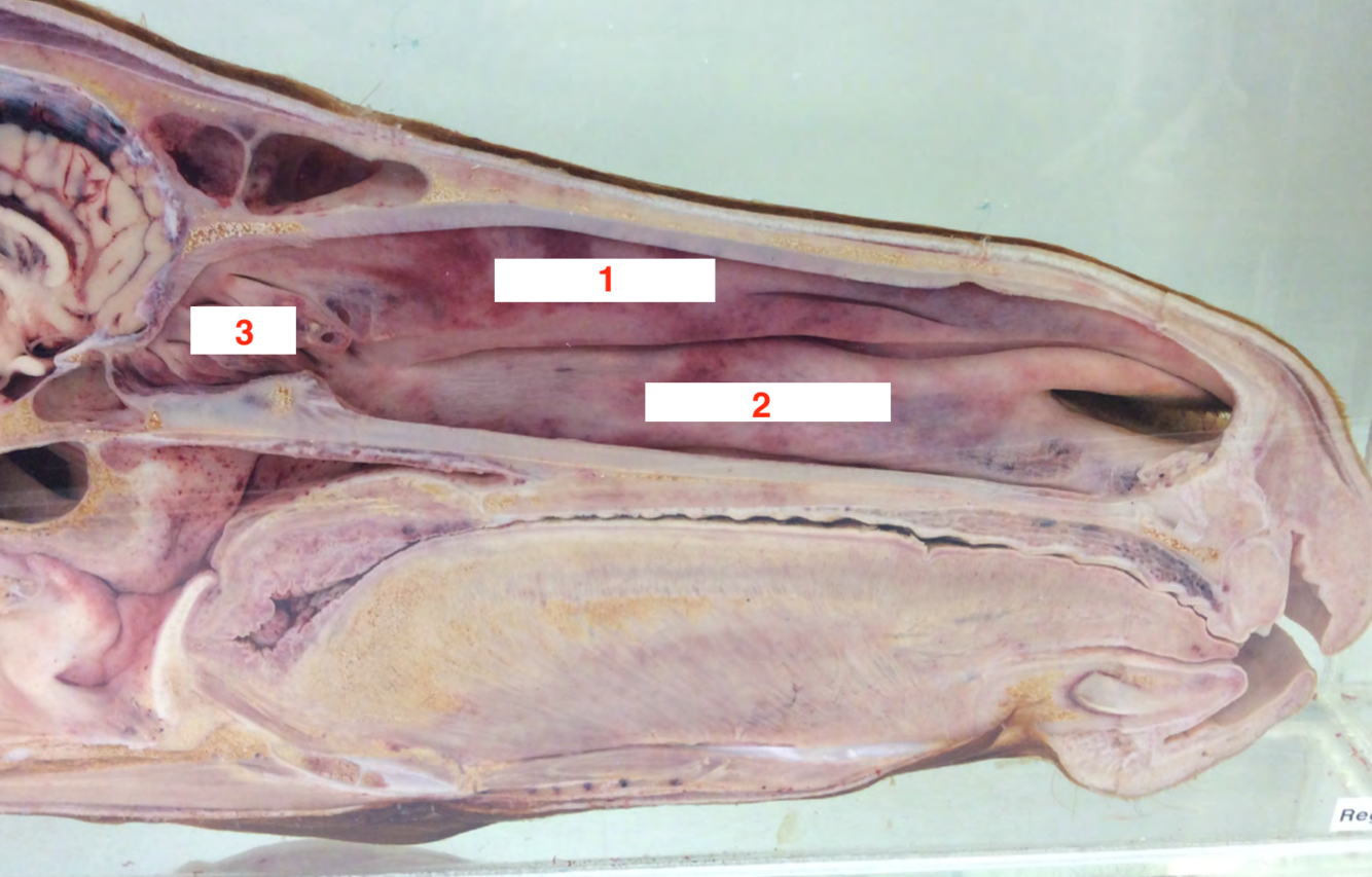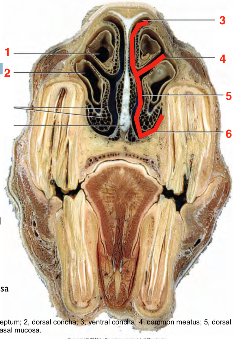 • Ventral and common meatus = main airway (nasogastric tubing) • Middle meatus = to paranasal sinuses • Dorsal meatus = to ethmoidal sinuses