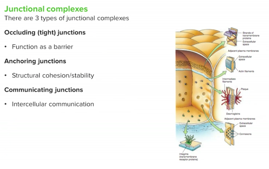 Epithelial cells are held together by which of the following? a) Basement membrane. b) Collagen. c) Fibroblasts. d) Junctional complexes. e) Connective tissue.