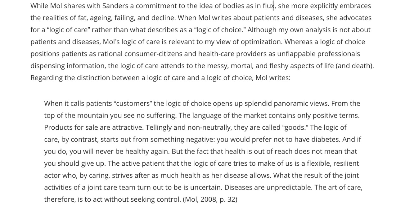 Taken together, ParticipACTION and Fitbit make visible an orientation of health awareness: Optimization. Each of ParticipACTION and Fitbit promotes an altar of health where health is defined as a socially and physically fitter (optimized) self, always just out of reach and attainable in the future. Each of ParticipACTION and Fitbit relies on and reinforces the piety that time is a resource to be managed. This piety is anxiogenic insofar as they perpetuate a cruel optimism that the future holds a better self. Furthermore, they ignore the possibility of sickness and limited abilities, and the inevitability of ageing, while providing an orientation of Optimization that is, by definition, unachievable. If more movement is always better, and acting now ensures better health later, there is no achievement too high, and arguably, no end to achieve.