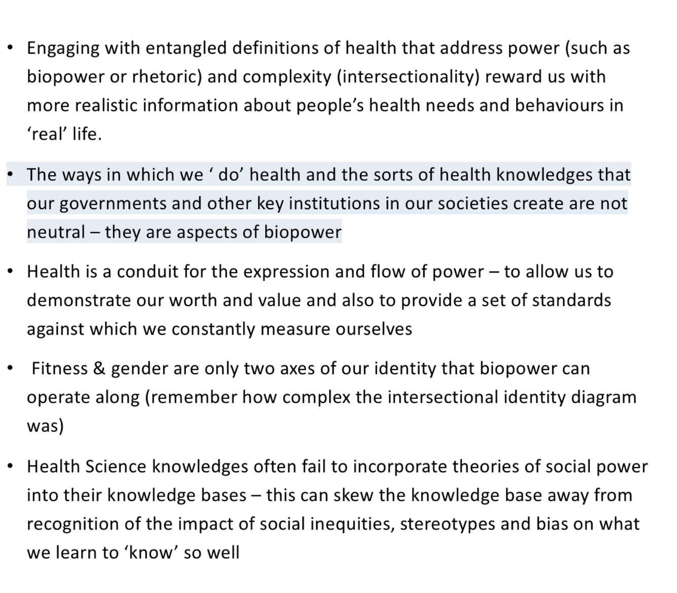 • The ways in which we ‘ do’ health and the sorts of health knowledges that our governments and other key institutions in our societies create are not neutral – they are aspects of biopower