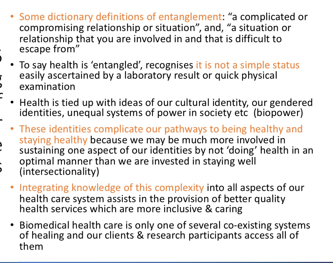 • Engaging with entangled definitions of health that address power (such as biopower or rhetoric) and complexity (intersectionality) reward us with more realistic information about people’s health needs and behaviours in ‘real’ life.