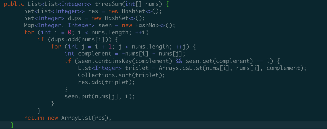 List triplet = Arrays.asList(nums[i], nums[j], complement);