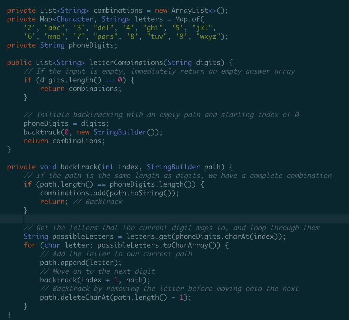 In backtrack: if path is the same length as input digits, we have complete combination. Else, get the letters that the current digit maps to, and loop through them. In that loop, add letter to our current path, move on to the next digit, backtrack by removing the letter before moving onto the next
