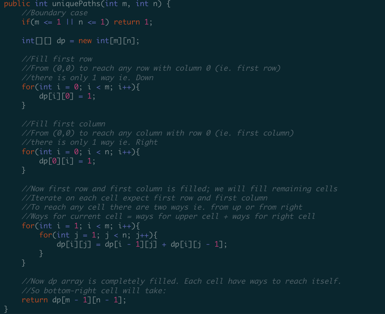 if(m \<= 1 || n \<= 1) return 1;int[][] dp = new int[m][n];