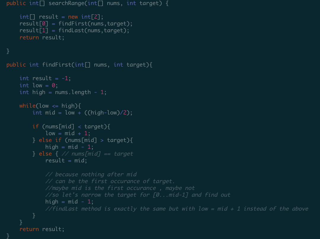 // because nothing after mid // can be the first occurance of target. //maybe mid is the first occurance , maybe not //so let's narrow the target for [0...mid-1] and find out high = mid - 1; //findLast method is exactly the same but with low = mid + 1 instead of the above } } return result; }