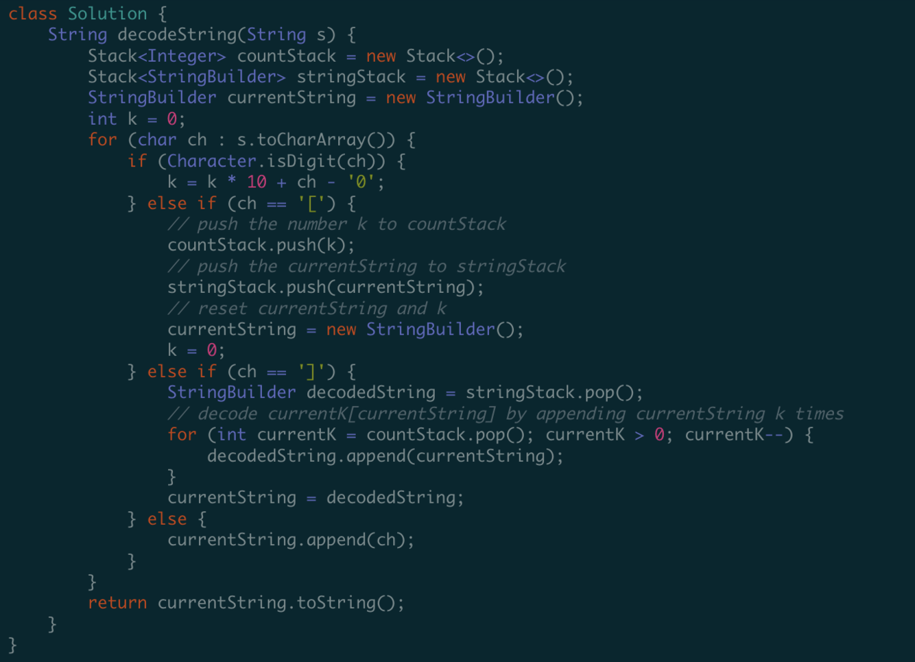 Space: O(m+n), where m is the number of letters(a-z) and n is the number of digits(0-9). Worst case, stringStack = m, countStack = n.