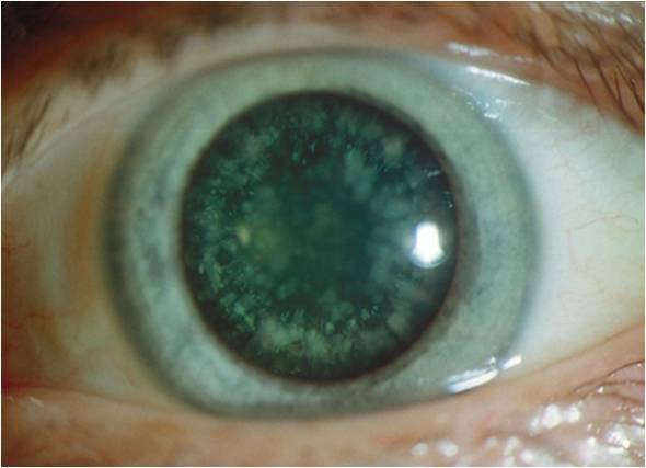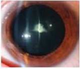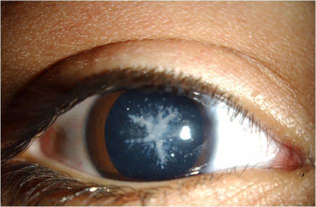 Description: common, bilateral and symmetrical (not always), round grey opacities that surround the nucleus. Often due to metabolic disorder.