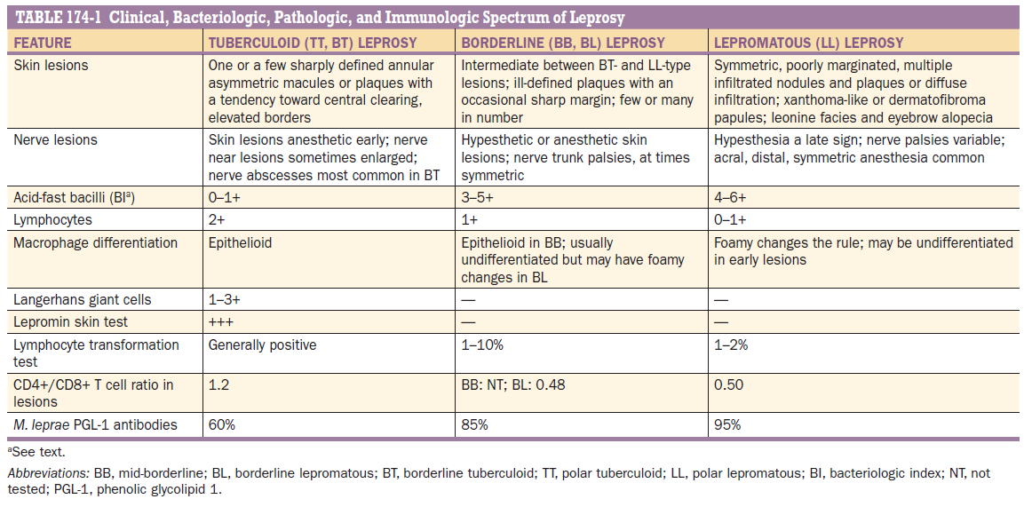 Various spectrum of leprosy based on clinical , bacteriologic, pathologic, and immunologic parameters