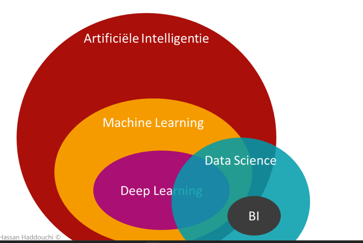 geef visueel de relatie weer tussen: AI, machine learning, deep learning, data science en BI