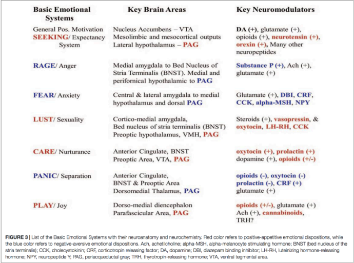 Panksepp zegt dat specifieke emotionele basiservaringen gekoppeld zijn aan driftcircuits in specifieke breingebieden; secretie van specifieke neuromodulatoren. Geef dit schematisch weer