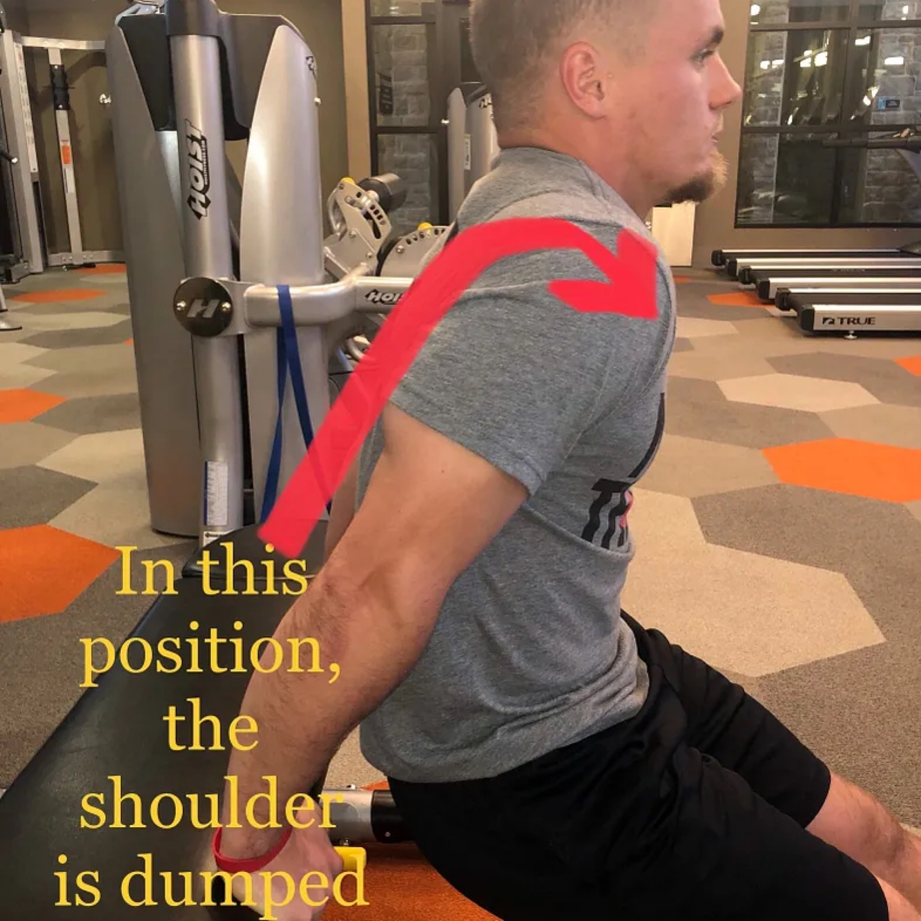 Forward tilting of the shoulder due to overuse of certain muscles like latissimus dorsi and biceps brachii, without proper upper back extension, causing the shoulder to only have space at the front.