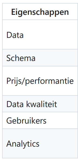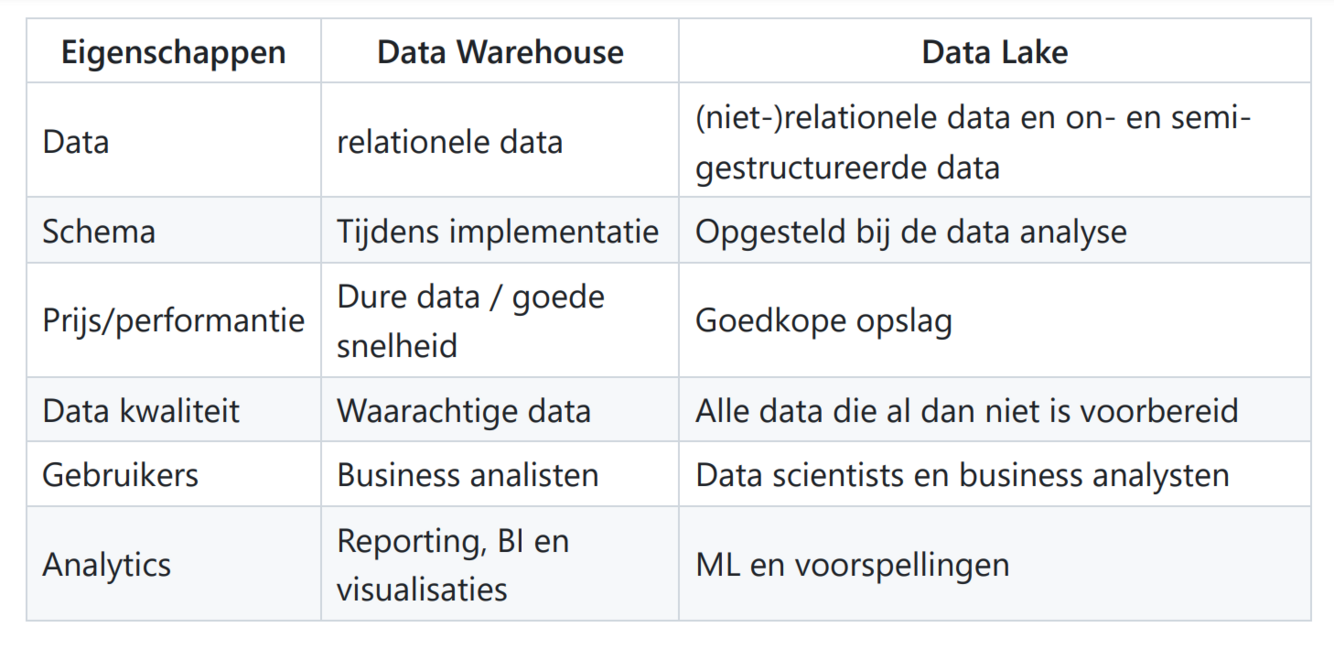 geef deze eigenschappen voor data warehouse en data lake