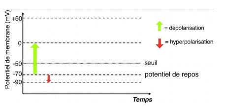 La dépolarisation représente le fait de faire rapprocher le potentiel membranaire proche de 0 en changeant le potentiel intracellulaire à l’instar de l’hyperpolarisation