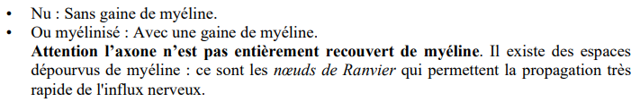 Par exemple, la propagation de la douleur est plus lente car elle est faite par des neurones non myélinisés, alors que la propagation motrice est beaucoup plus rapide car elle est assurée par de gros neurones myélinisés