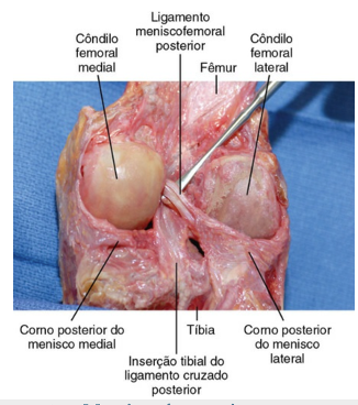 O ligamento meniscofemoral anterior (Humphry) percorre anteriormente o LCP, e o ligamento meniscofemoral posterior (Wrisberg) corre obliquamente atrás do LCP. No mínimo, um desses ligamentos está presente em 91 % dos joelhos.