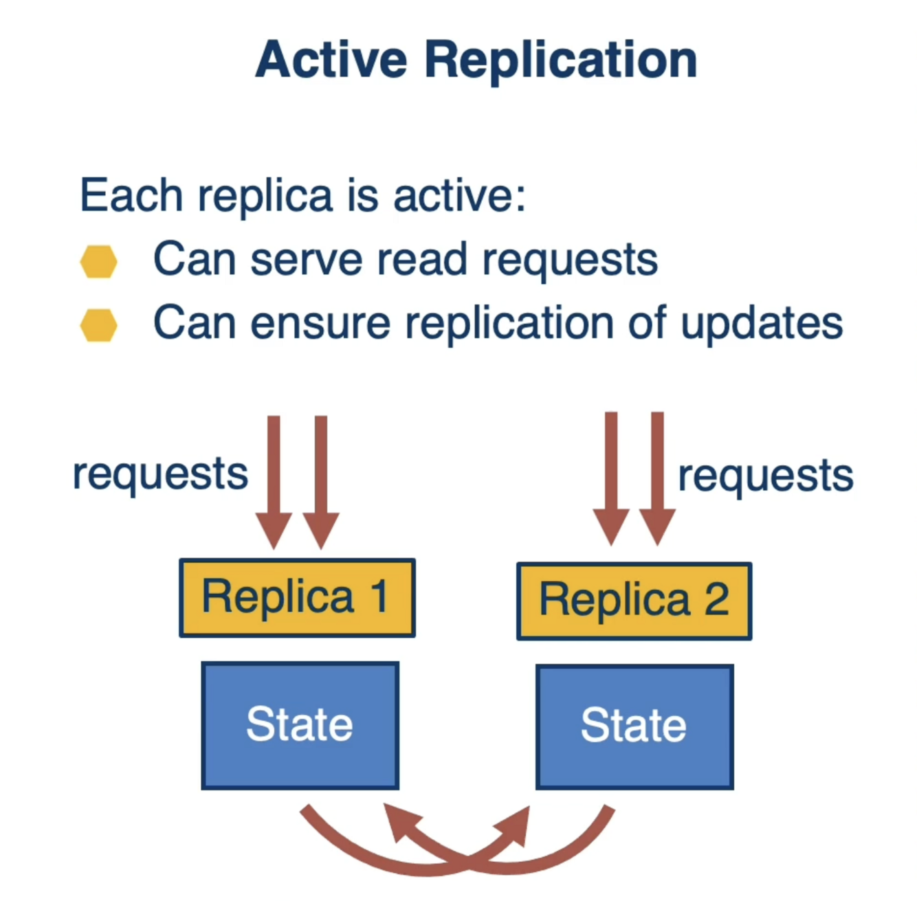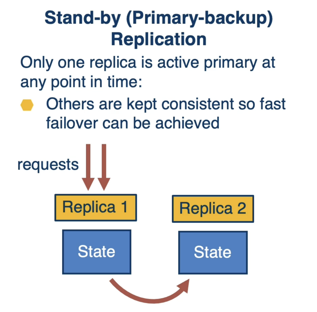 Only one replica is active at any point in time. Others are kept in a consistent state so fast failover can be achieved. The primary replica serves requests & ensures replication of updates.