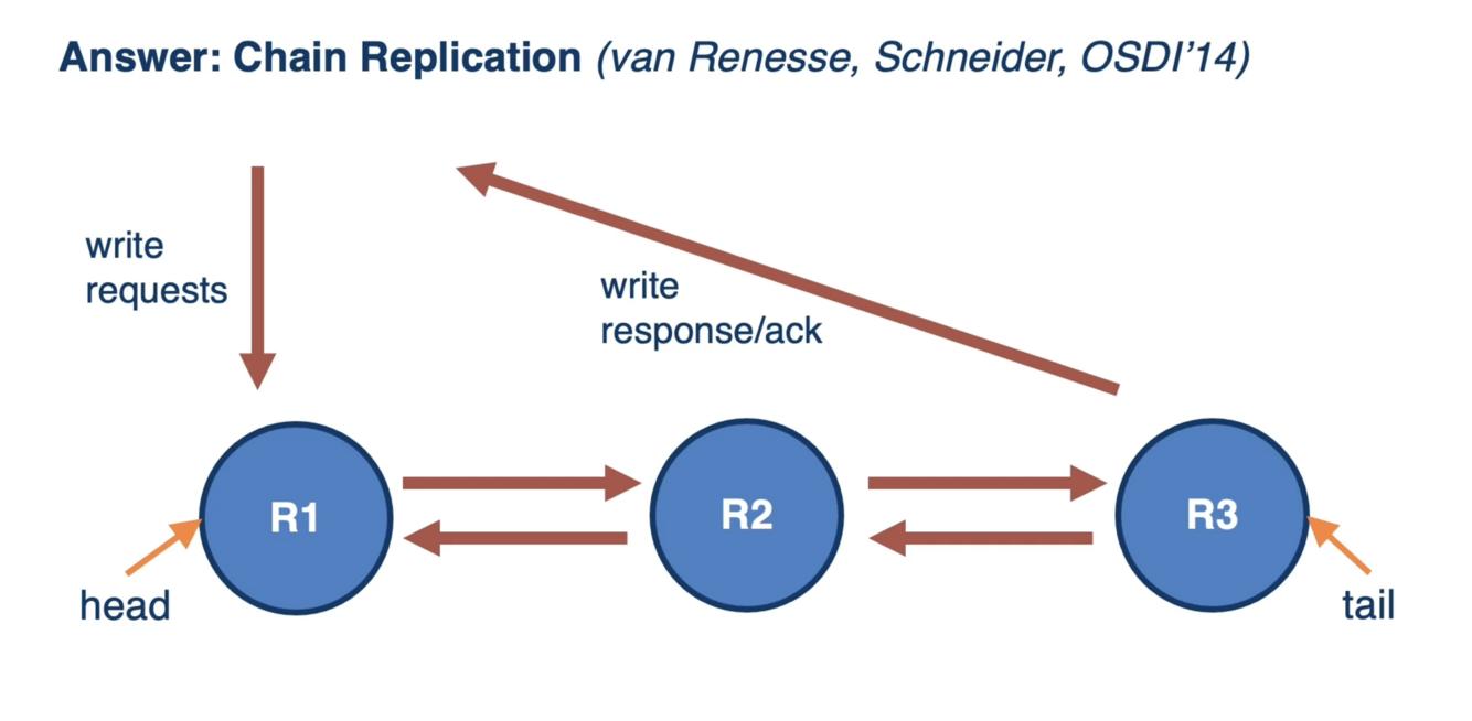 On write request, each replica write updates to the next replica in the chain (as opposed to the leader communicating with all replicas).