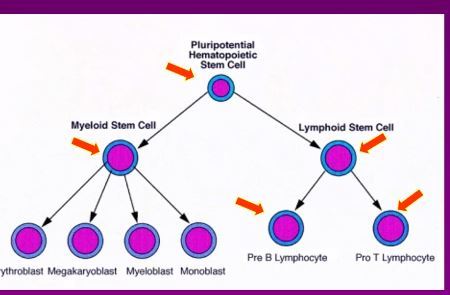 series of mutations in myeloid or lymphoid stem cells