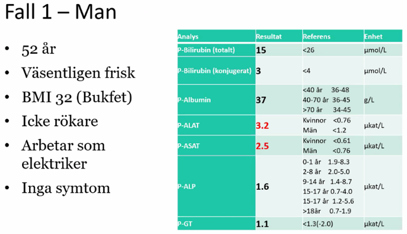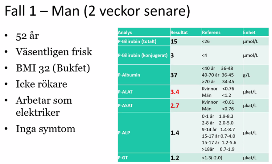 Denna man har lämnat prover för andra gången och visar på fortsatt lätt förhöjd ALAT/ASAT. Vilka prover vill du ta nu och varför?