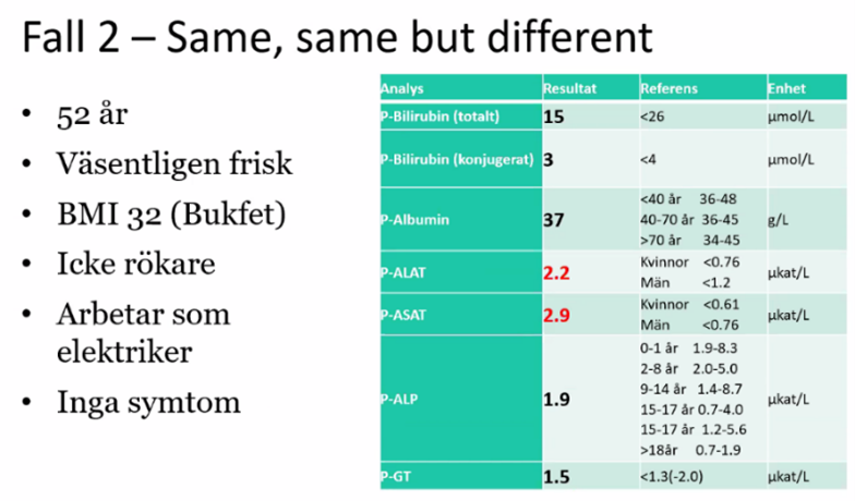 Den här mannen lämnar nya prover där ALAT/ASAT är fortsatt lätt förhöjt, vilka orsaker finns till lätt kronisk ALAT-stegring vid leversjukdomar?
