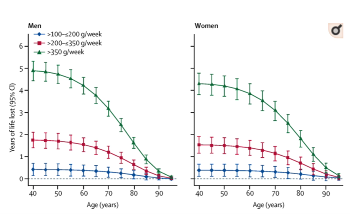 YLL (Years of Life Lost) beroende på konsumtion av alkohol och ålder