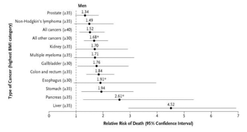 Ohälsosamma matvanor är främst kopplat till övervikt och fetma som ökar risken för cancer (lever mest) – bilden visar för män, hos kvinnor dominerar istället?