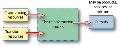 Transformational resources (those people, skills, information, plant, equipment and technology) that do the transforming, and the transformed resources (raw materials, components, information and customers) that are transformed. These enter a process, operation or system (which exists in its specific context) and transforms (by combining the transformational and transformed resources) into a number of outputs(outputs may be products, services or a mixture of the two). Outputs should have greater value than the individual inputs - hence you have a process, operation or supply network that delivers value.