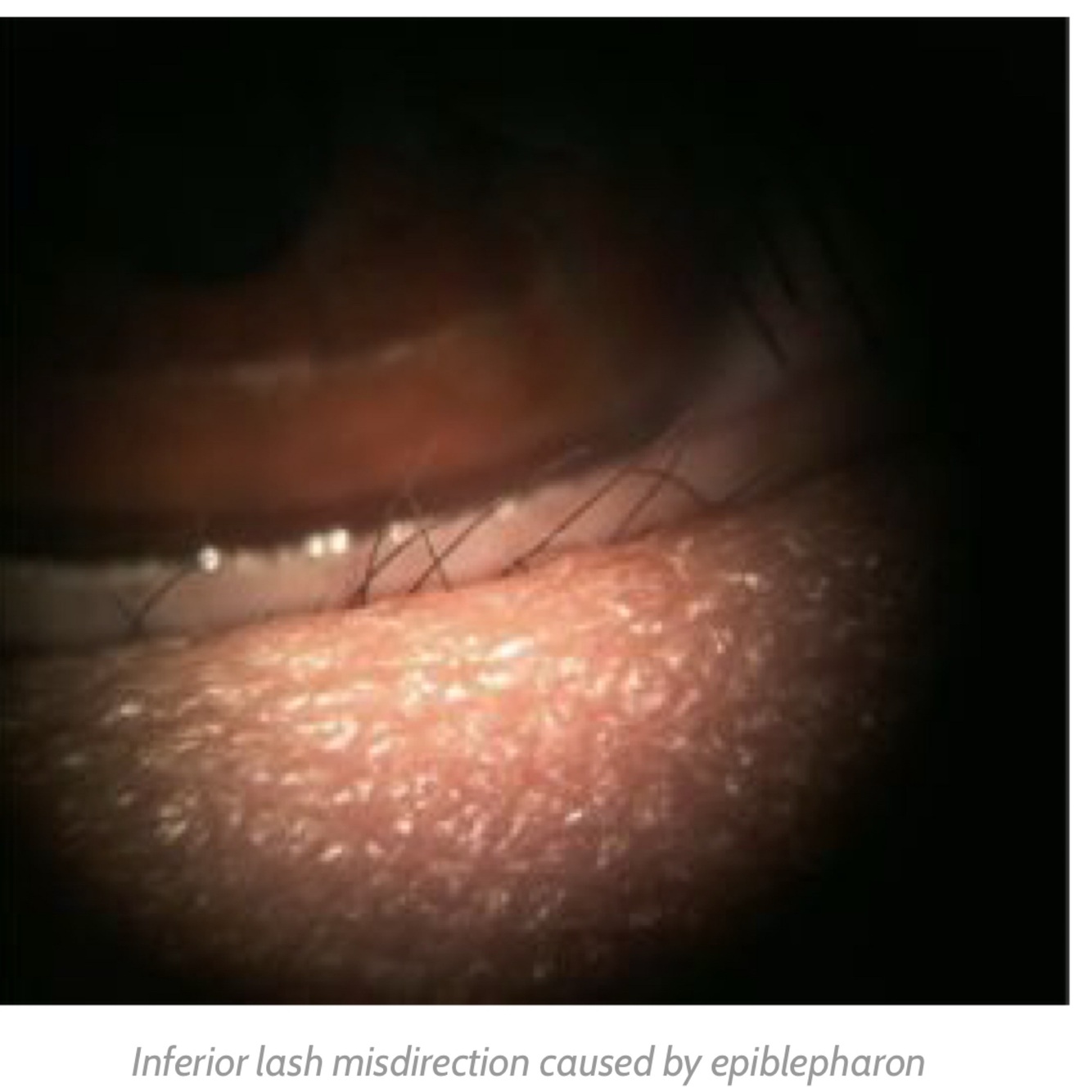 (Absence of lower lid crease, causing eyelashes to be oriented vertically)