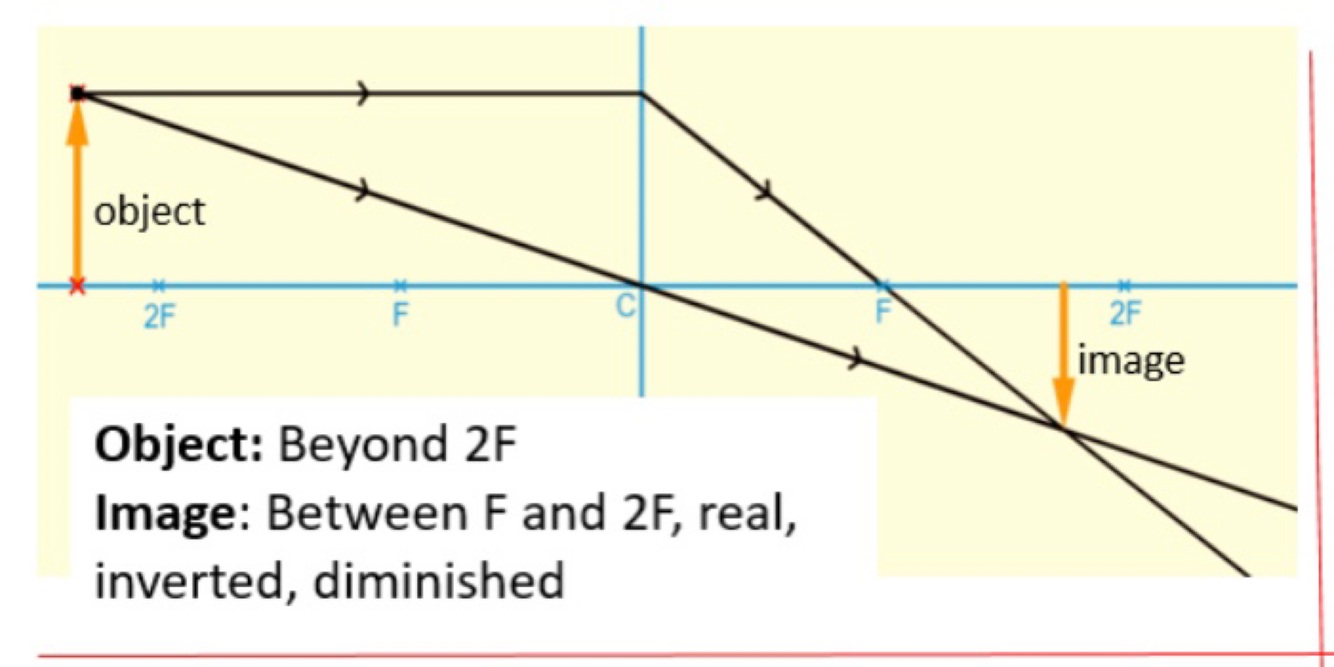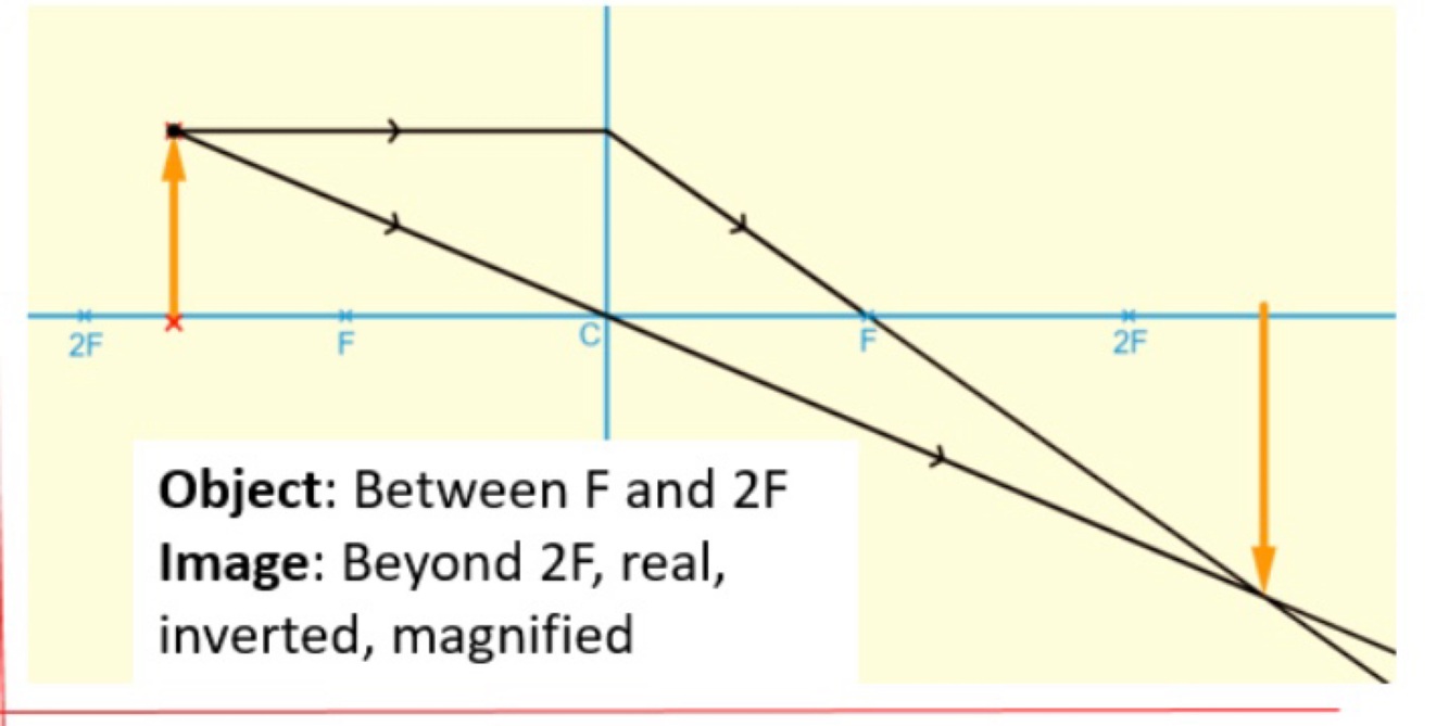 - draw a straight line from the top of the object to the top of the lens and then taking a sharp turn to go through the principal focus (f)