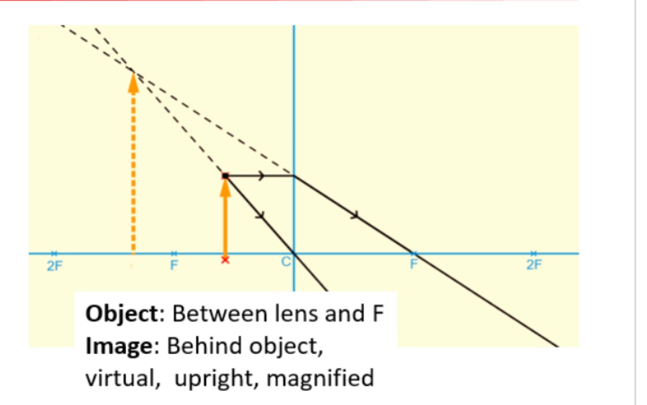 - one straight line through the middle of the lens, start from the object and go through the middle of the lens, already diagonal
