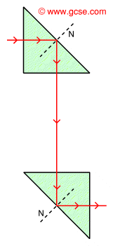 Critical angle for glass is 42 so ray is totally internally reflected and turned through 90