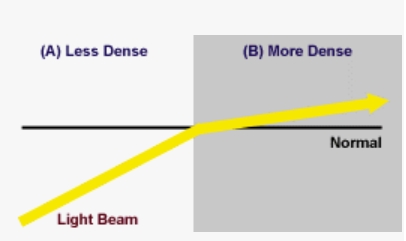 What happens to light rays when they pass from a less dense to a more dense medium?