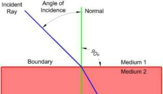 A line at 90 degrees to the boundary between two substances acting as mediums