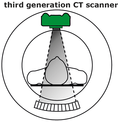 A Computerised Tomography (CT) scan uses a beam of x-rays which spiral round the patient. This can be used to construct a 3D image in slices of the inside of the body.