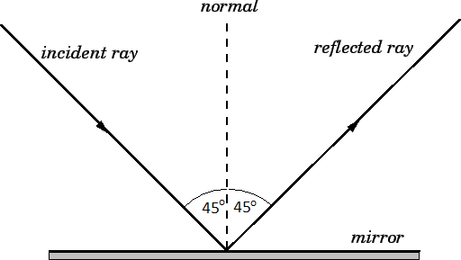 Draw a ray diagram showing the reflection of a light ray at an angle of incidence of 45o
