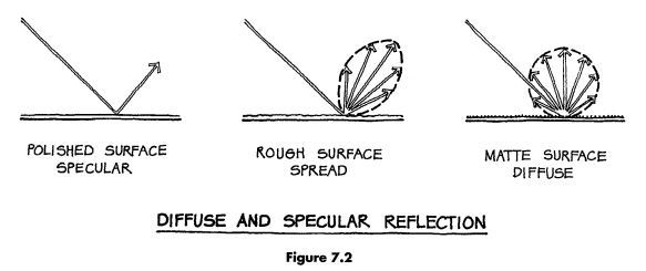 When light bounces off the material; secular; diffused; opaque (all light is either reflected or absorbed, or both)
