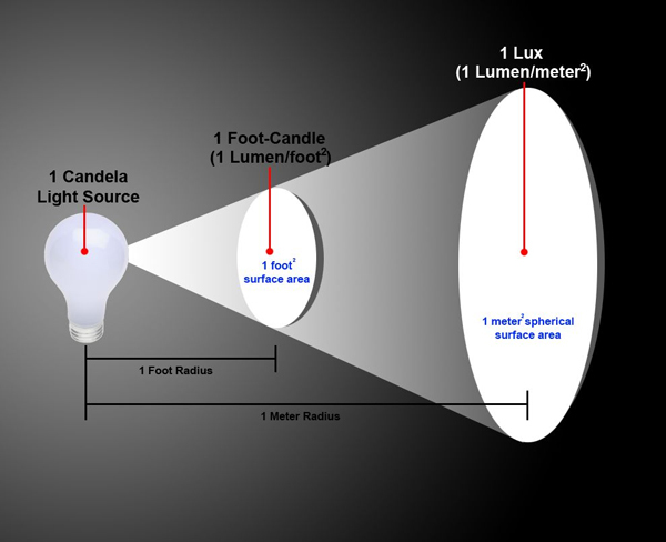 To place a candle one foot from a blackboard there would be one lumen arriving on one squaure foot of blackboard surface, called illumination (E). the value would be called one footcandle (fc).