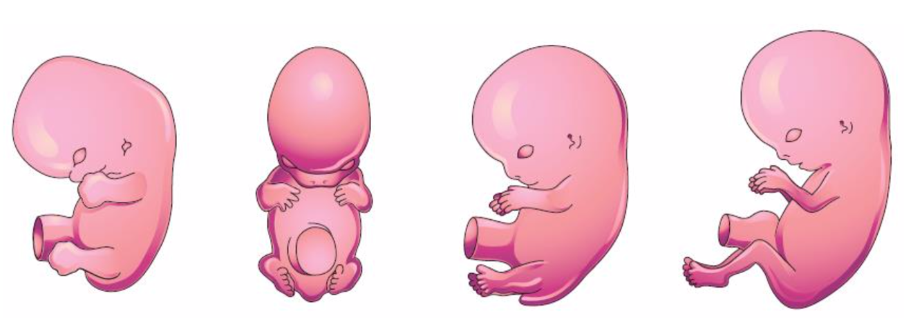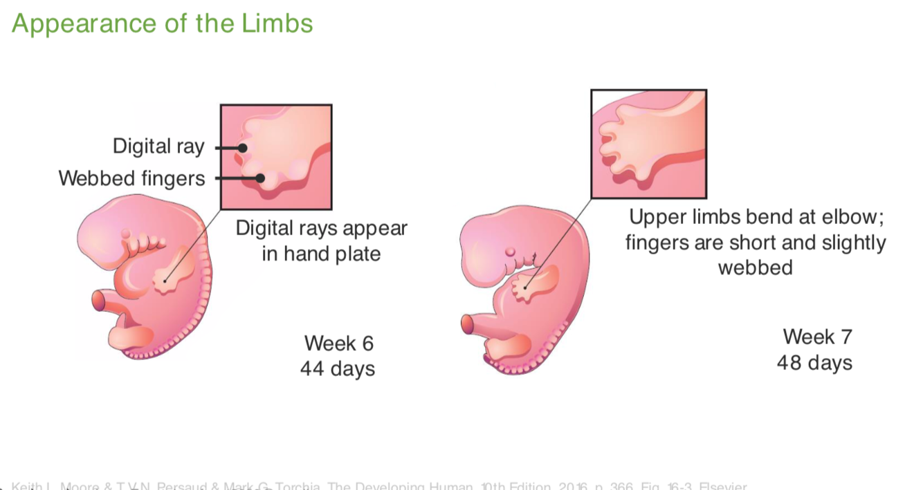 Upper and lower limb buds bend at the elbow and knee with the palms and soles of the feet facing medially.