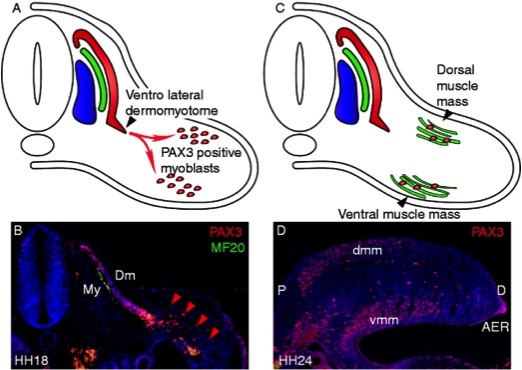 Figure 3 (A) Schematic of myoblast migration from ventrolateral dermomyotome into limb buds. (B) Immunostaining of transverse section of HH stage 20 chicken embryo. PAX3 (red) -positive cells are shown delaminating and entering limb bud (red arrowheads). (C) Schematic of dorsal and ventral muscle masses formed by limb bud myoblasts. Undifferentiated precursors (some of which will give rise to satellite cells in adult muscles) are shown in red with differentiated myotubes shown in green. (D) Immunostaining of transverse section of HH stage 24 chicken embryo. PAX3 (red) cells are restricted to the dorsal and ventral regions of the limb bud. My, myotome; Dm, dermomyotome; P, proximal; D, distal; dmm, dorsal muscle mass; vmm, ventral muscle mass; AER, apical ectodermal ridge of limb bud.