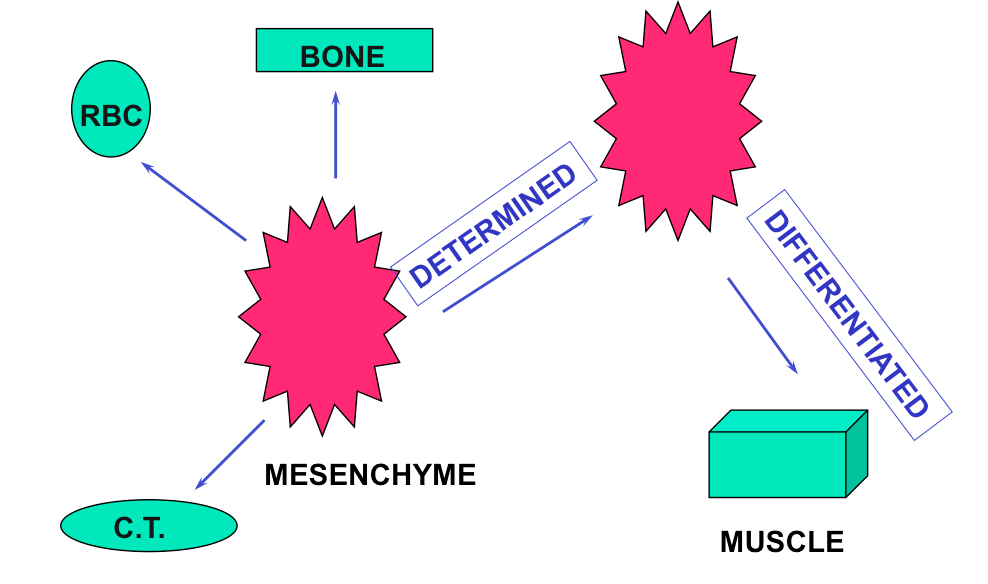determination: transcription factor(s) dictate to (mesenchymal) cells that it will become (muscle), even though it looks the same, it’s determined to be something else