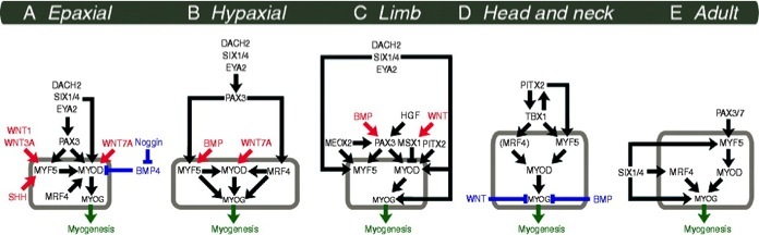 Figure 4 Comparison of the signalling pathways leading to MRF expression and myogenesis in epaxial and hypaxial somite, limb, head and neck, and adult. In grey boxes are the core network of MRFs in activating myogenesis from different tissues. Positive regulatory signals are shown in red, and inhibitory signals are shown in blue. Black arrows show genetic interactions. (A) Epaxial somite: DACH2, SIX1/4, EYA2, PAX3, MYF5 and MRF4 induce MYOD, thus leading to myogenin (MYOG) expression and myogenesis. WNT1, WNT3A and SHH up-regulate MYF5 expression, and WNT7A up-regulates MYOD. BMP4 negatively regulates MYOD but is itself inhibited by noggin. (B) Hypaxial somite: DACH2, SIX1/4 and EYA2 are capable of inducing PAX3. Subsequently, PAX3 induces MYF5 and MRF4, which in turn activate MYOD expression, followed by MYOG expression and myogenesis. BMP and WNT7A positively regulate MYF5 and MYOD expression. (C) Limb: DACH2, SIX1/4, EYA2, PAX3, MEOX2 and PITX2 are capable of inducing MYF5 and MYOD; subsequently, MYOD induces MYOG expression and myogenesis. MSX1 can inhibit MYOD expression. BMP and HGF up-regulate PAX3 expression, and WNT regulates MSX1. (D) Head and neck: PITX2 and TBX1 induce each other and MYF5. TBX1 is capable of inducing MYF5 expression (and MRF4 in those head muscles which express it) before activating MYOD expression. Subsequently, MYOD induces MYOG expression followed by myogenesis, but inhibitory signals from WNT and BMP can also regulate MYOG expression. (E) Adult: PAX3/7 directly induce MYF5 expression, whereas SIX1/4 can induce MRF4, MYF5 and MYOG. MRF4 and MYOD activate MYOG expression followed by myogenesis.