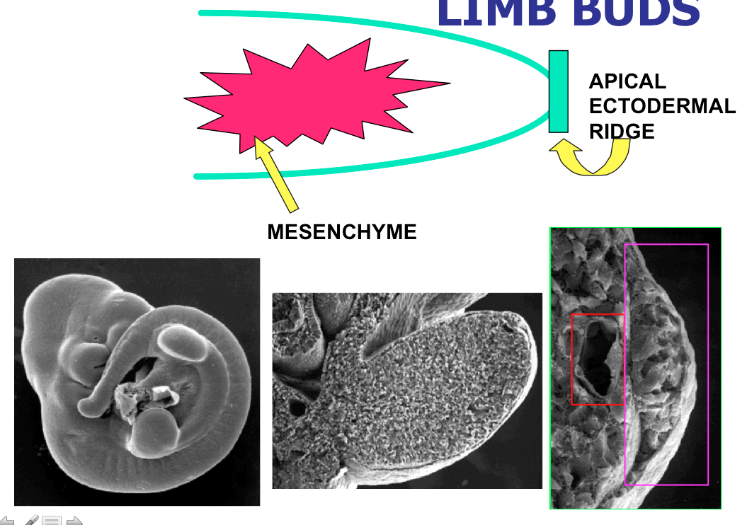 growing limb bud has only mesenchyme, surrounded by a layer of ectoderm which thickens at the tip–>apical ecodermal ridge