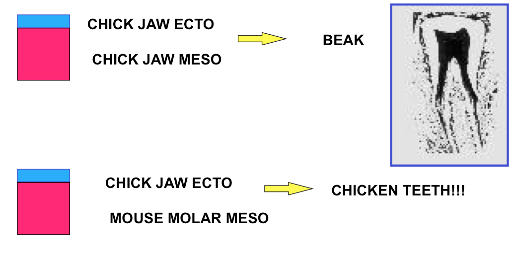 CHICK MUST HAVE LOST MOLECULES THAT INDUCE EXPRESSION OF TOOTH MAKING GENES DURING EVOLUTION - SO THEY NO LONGER MAKE TEETH